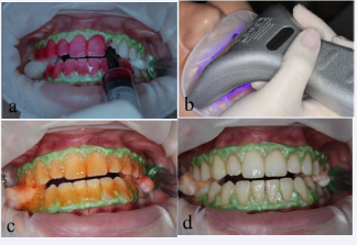 Figure 4 Bleaching protocol for each application of the 35% Lase Peroxide Sensy gel: after mixture of phases 1 and 2 the gel was applied with the aid of a syringe, covering the buccal surface of premolars and anterior teeth (a); next the gel was irradiated with the Whitening Lase II hybrid light source (DMC Equipments) for 6 minutes (b); after 10 minutes of contact between the gel and the teeth, the former changed its color (c); so the gel was removed from the teeth surfaces with an aspirator tip and cleaned with some gauze (d). The clinical steps from “a” to “d” were repeated.