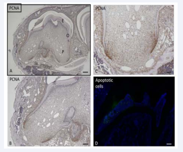 Figure 1 A, B, and C: Proliferation visualized by the cell nuclear antibody (PCNA). PCNA positive cells are present in the apical zone (in the apical cell-rich zone). D: Apoptotic cells are stained in the apical zone of the root (TUNEL staining). Roots are in the process of lengthening. P= pulp, O= odontoblasts, E= enamel. Bars: A,C=300micrometers; B,D = 75micrometers