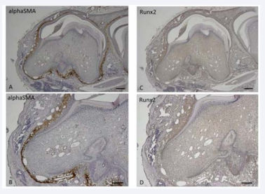 Figure 2 A & B: Immunolabeling of the periodontal ligament by alpha Smooth Muscle Antibody (SMA). C & D: tooth germ labeling by Runx2 antibody. Bars: A, C = 200 μm, B, D =300 μm.