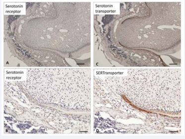 Figure 3 Root apical zone of the forming tooth. A & B: Immunolabeling for serotonin receptor. Bar= 100µm. C & D: immunolabeling for serotonin transporter. Bars: A, C = 300 μm, B, D =75 μm.