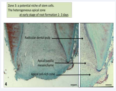 Figure 4 Respective location of the apical cell-rich zone, the apical papilla mesenchyme and radicular dental pulp. These are niches for stem cells at early stages of root formation. (at 1 to 3 days).
