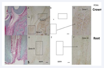Figure 6 A & D: Zones I, II and III in the molar after the preparation of a cavity (asterisk). Coronal zone labeled with PCNA (zone I); E & F: Zone III: apical zone of the molar.