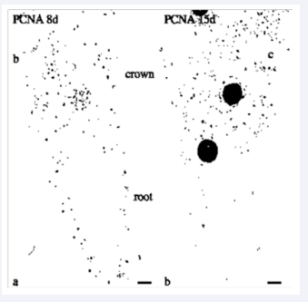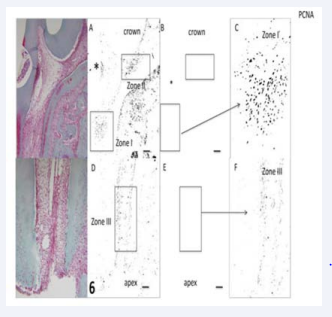 Zone I and zone II are located in the crown, namely they occupy the isthmus between the mesial and central pulp. In contrast, zone III is located in the apical root [8,9]. PCNA labeling is important in the root, and more restricted in the crown. It is also in zone III that a few cells underwent apoptosis. Apoptotic cells are rare and only detectable near the apex (Figures 1,4-8).