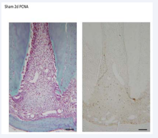 Figure 7 A: H&E staining of a sham rat. B: PCNA labeling. Molar day 2. Bar= 100µm.