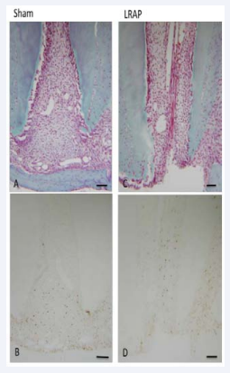 Figure 8 A & B: Sham rat. The apical cell-rich zone is labeled. C & D: Labeling after 2 days with leucine-rich amelogenin peptide (LRAP). The radicular dental pulp is labeled. Bar= 100µm