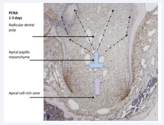 Figure 9 Schematic sliding of stem cells from the apical cell-rich zone to the apical papilla mesenchyme, followed by migration of the cells toward the radicular dental pulp. PCNA labeling of pulp cells after 1-3 days.