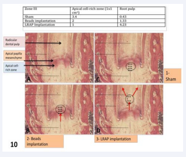 Figure 10 A: Localization in the apical cell-rich zone. B: After beads implantation, cell migration starts. C: Sham molar. Labeled cells are present in the apical cell-rich zone. D: After implantation of beads loaded with LRAP labeled cells are present in the radicular dental pulp.
