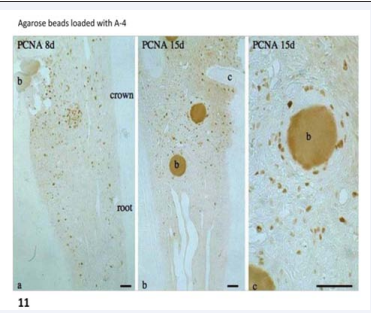 Figure 11 a: Implantation of agarose beads loaded with A-4 (an amelogenin peptide with exon 4 deletion), after 8 days. PCNA labeled cells are located beneath the odontoblast layer and in the crown. b & c: At 15 days, no labeling is detected in the root and labeled cells are seen in the crown around the beads. Bar= 100µm.