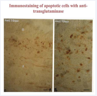 Figure 14 A & B Immunostaining of apoptotic cells with a transglutaminase antibody. Some sub-odontoblastic Hoehl’s cells are labeled. No labeling is seen in the odontoblast layer (O), and in the dental pulp (P). Bar= 100µm.