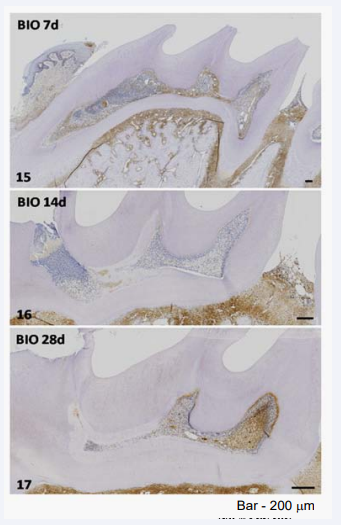 To conclude, firstly mesenchymal cells slide from the apical part to the sub-odontoblastic border (the so-called Hoehl’s cell layer)(see root lengthening). Then, secondly, odontoblasts migrate toward the coronal pulp, and BIO influences the migration between the mesial to the central pulp chamber parts. The first and second cell sliding constitute crucial events leading to the formation of reactionary and reparative dentine, and subsequently to pulp mineralization (Figures 15-17).