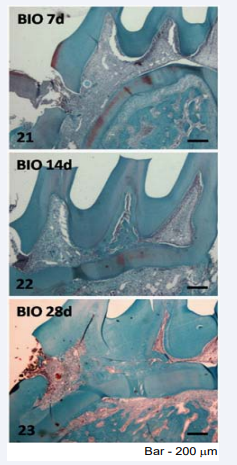 Figure 21-23 Bio implanted for 7-28 days induce the formation of a mineralized tissue in the isthmus between the mesial and central pulp chambers. Bar= 200μm.