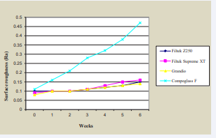 Compoglass F showed a dramatic increase in Ra values over time, while the composite resins were not affected by bleaching procedure until week 4 when bleached with 20% CP. The increase in surface roughness of Compoglass F (compomer) after bleaching might be attributed to the resin matrix and fillers of the material being different from the composite resins tested. Water uptake and expansion has been reported in compomers that may result in stress corrosion and complete or partial debonding of fillers leading to cracking and increased surface roughness [15]. Furthermore, the resin matrix of compomers may be more susceptible to hydrolysis and oxidation. Clinical studies demonstrated that surface roughness of compomers was significantly increased when exposed to bleaching agents [18]. SEM evaluations have showed cracks [15,19], chemical alterations and surface dissolution [13] in the restorations after their exposure to 10% and 15% CP.