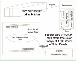 Figure 1 Our new type of gas stations [44], selling not only the Carbon Negative fuels but also the distilled water we will produce in abundance from the sea water using Equator areas of Earth for the best insulation of our solar panels batteries combined with the alkaline batteries for 24/7/365 operations we plan to purchase at substantial discounts from the national shipyards decomposing the submarines of various types along with the DC motors from the same submarines to power our distillation and shipment boats / ships.