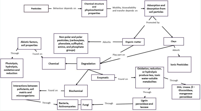 b) Chemical degradation of pesticides is governed by abiotic factors, includes soil properties such as chemical composition, organic matter, clays percentage, water content, oxidationreduction potential and pH [22]. Chemical degradation occurs through reactions such as photolysis, hydrolysis, oxidation and reduction, for example organophosphates can be chemically degraded by alkaline reactions in soils [1,23].