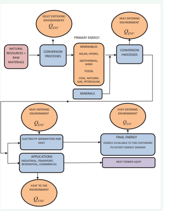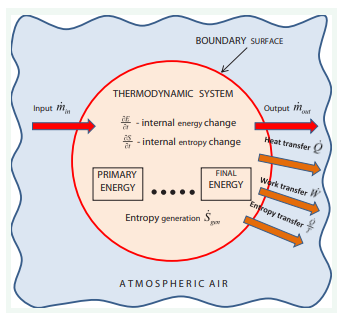 These questions lead us to consider where is wasted and how less energy can be used. Answers to these questions come from the laws of thermodynamics and the concepts of reversibility and entropy generation. The first law of thermodynamics, or energy conservation, states that energy cannot be destroyed or created. It guarantees the exact equivalence of various energy forms but does not ensure interconvertibility. Except for thermal energy (heat), all other forms of energy can be converted entirely into heat; the reverse process is impossible. The second law of thermodynamics defines quality differences between different forms of energy. The net effect of every transformation is the degradation of higher- quality energy to lower-quality energy. The degree of energy degradation, or dissipation, is described by a function proposed by Rudolf Clausius, who introduced the concept of entropy as a new physical quantity as fundamental and universal as energy [11]. The second law of thermodynamics states that every thermodynamic process is accompanied by entropy generation. The general scheme is presented in (Figure 4).