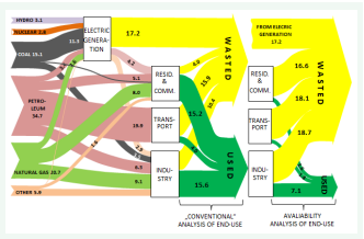 The energy dissipated Ej δ ? appears mainly in the form of heat and warms the atmospheric air layer. Conversion efficiency based on the first law of thermodynamics is misleading, as it cannot identify energy dissipation, possible improvements of energy systems and more effective use of natural resources. For example, Rose [15], explains the differences between these two approaches (energy flow of the US energy system), (see Figure 5).
