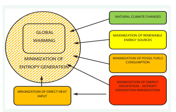 The contemporary climate modelling literature takes little account of the methods discussed above, particularly the constraints imposed by the second law of thermodynamics. Kleidon and Lorenz [18] and Paixoto and Oort [19] have discussed selected problems. However, their analyses were limited to entropy generation within the atmospheric layer (absorption of solar and terrestrial radiation, melting of snow and ice, evaporation, etc.). Entropy is the result of thermodynamic irreversibilities that are constantly present in all real processes involved in the chain of transformation from natural resources to final usable energy. Clearly, energy wastage should be minimized. To this end, Bejan [12] has proposed and developed a method based on the concept of reducing entropy generation.
