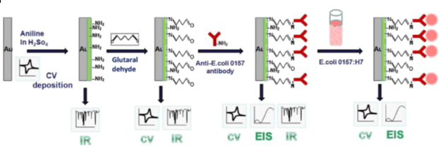 Impedance-based biosensors are designed on the basis of a widely used electrochemical technique; Electrochemical Impedance Spectroscopy (EIS). In EIS, a low voltage sinusoidal potential is applied at different frequencies to the electrochemical system and the impedance is measured as a function of frequencies using the resulting current [13]. A biorecognition element is immobilized on one of the electrodes which interacts with and binds to the analyte, causing changes in the impedance. The results of the impedance measurements are interpreted in terms of equivalent circuits [15]. The major advantage of impedance-based sensors over amperometric and potentiometric sensors is being a label-free technique. Efforts are being focused on development of novel technologies for more efficient employment of EIS concept for detection of pathogenic agents in water. Chowdhury et al. have reported development of a label-free polyaniline-based impedimetric biosensor for simple, rapid and inexpensive detection of E. coli O157:H7 [16] (Figure 1).
