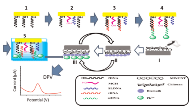 Different voltammetric methods such as cyclic voltammetry, square wave voltammetry and differential pulse voltammetry have shown important advantages in the analysis of environmental samples [25-27]. These methods have been also employed for pathogen detection in water samples. Fernandes et al. have introduced a highly sensitive electrochemical genosensor based on multiwalled carbon nanotubes-chitosan-bismuth and lead sulfide nanoparticles for the detection of pathogenic Aeromonas [28]. Lead sulfide nanoparticles coated with 5′-(NH2) oligonucleotide through 1-ethyl-3-[3-dimethylaminopropyl] carbodiimide hydrochloride (EDC) cross-linkers have been used as signalizing probe DNA (szDNA) and another complementary sequence of DNA with thiol modification which can strongly get adsorbed on the gold surface has been employed as the fixing probe DNA (fDNA). The hybridization of these two probes with the DNA sequence of the target Aeromonas (tDNA) (fDNA-tDNAszDNA) has been detected by differential pulse voltammetry (DPV) after the electro-deposition of the lead nanoparticles (PbS) released from sz-DNA on the glass carbon electrode surface modified with MWCNT–Chi–Bi which improves the deposition and signal transduction. The developed biosensor has been reported to have the highest sensibility for target gene detection in comparison to related biosensors and even polymerase chain reaction (PCR). The detection limit for this biosensor has been 1.0×10−14 mol L-1 and it has been capable of detecting Aeromonas in spiked tap water samples at concentrations lower than 102 CFU mL−1. Schematic presentations of the biosensor development and its working principle have been illustrated in (Figure 2).