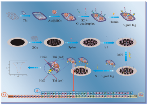 Li et al. also have recently developed another biosensor for detection of E. coli O157:H7 which is based on HRP-mimicking hemin/G-quadruplex wrapped GOx nanocomposites [29]. In this work the graphene oxide (GOx) has been used as the nanocarrier to immobilize thionine (Thi) and the Au nanoparticlecoated SiO2 nanocomposites (Au–SiO2 ) through electrostatic adsorption and the adsorption among nanomaterials. Then on the GOx–Thi–Au@SiO2 nanocomposites a large amount of signal DNA (S2) and G-quadruplex has been immobilized. Afterwards, interpolating hemin into the G-quadruplex has lead to the hemin/G-quadruplex structure as HRP-mimicking DNAzyme. E. coli attaching and effacing (eaeA) gene (S) (5’-GTCACAGTTGCAGGCCTGGTTACAACATTATG-3’) [30] has been selected as the target ligand due to being an excellent genomic marker to E. coli O157:H7 and differential pulse voltammetry (DPV) has been employed as the detection method. The developed biosensor has been shown to detect E. coli O157:H7 using a calibration curve with a dynamic linear range of 0.02 to 50.0 nmol L-1 and a detection limit of 0.01 nmol L-1 (S/ N=3). The schematic illustration of the stages for GOx–Thi–Au@ SiO2 nanocomposite preparation and the biosensor fabrication and detection mechanism has been shown in (Figure 3).