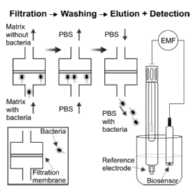Figure 4: The experimental set-up for sample pre-treatment and E. coli detection using the potentiometric aptamer-based biosensor. Reprinted from Zelada-Guillén et al. [33] Copyright (2010) American Chemical Society.