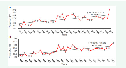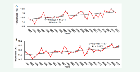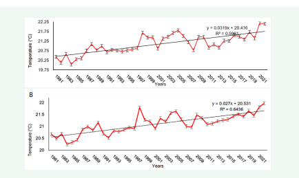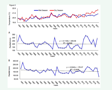 Figure 5: Seasonal Temperature Pattern (1981-2022). A: Annual rainfall trend of Ndu (1981-2021). B: Annual rainfall trend of Nkambe (1981-2021).