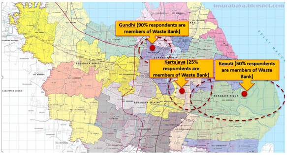 were selected from (1) Gundih, (2) Keputih, and (3) Kertajaya, after consulting the city staff for the field survey considering their level of participation in the Waste Bank Program, assurance of the CBOs to support the data collection activities, similarities with other communities in the city, time limitations and financial constraints. Gundhi was the community defined as having the most active waste bank with 90% of respondents to the survey being members. Keputi was less active with 50% of respondents being members and Kertajaya the least with 25% of respondents being members.