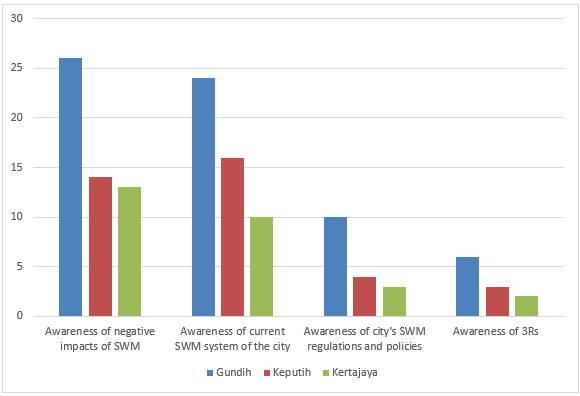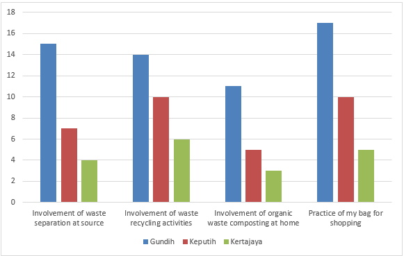 Figure 5 shows the survey results regarding waste separation, practice of waste recycling and composting and sustainable lifestyle activities. According to the results, 54% respondents in Gundih involved in waste separation at source which is essential for the effective operation of waste banks and recycling. In contrast, about 25% and 14% respondents of Keputih and Kertajaya are practicing waste separation at source. This result indicates that the respondents in communities with active waste banks are participating more in waste separation at source rather than others. However, being a member of a waste bank and having awareness raised regarding waste separation do not guarantee securing community participation. Observations show that effective waste storage, collection and treatment systems and infrastructure are also necessary for effective operation of the waste separation and collection system.