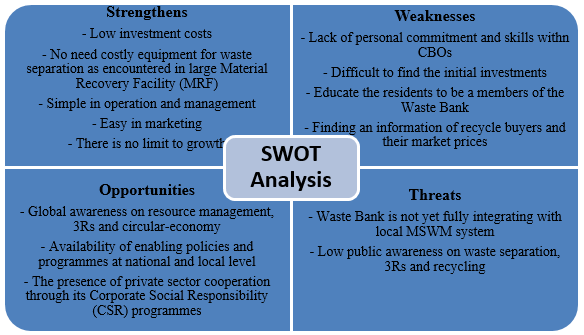 The study also aims to identify the key opportunities and challenges in implementing Waste Bank program and its expansion within the local MSWM system in the city based on the results of the multi-stakeholder workshop that was organized with the participation of representatives from waste banks (both managers and customers), community leaders, NGOs, academic and city staff on 14 April 2016 at ITS in Surabaya. SWOT analysis was used to understand the internal and external factors, including strengths, weaknesses, opportunities and threats for identifying the best strategies in increasing the expansion of waste banks in the city (Figure 4).