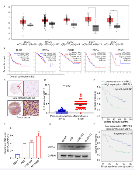 cancers, the TCGA database was searched, and the results indicated that MRPL3 was overexpressed significantly in several malignant cancers, including gastric cancer [Fig 1A]. Moreover, the survival rate analysis results showed that the elevated expression of MRPL3 was correlated with poor overall survival in gastric cancer but not in other malignant cancers [Fig 1B]. Therefore, we speculated that MRPL3 plays a critical biological role in the progression of gastric cancer. Additionally, IHC analysis verified that MRPL3 was overexpressed in gastric cancer patients [Fig 1C-D], and according to Kaplan?Meier survival analysis, MRPL3 gene expression was significantly correlated with overall survival and disease-free survival of gastric cancer; that is, with the increase in MRPL3 gene expression, survival decreased [Fig 1E-F]. Finally, compared with the normal gastric epithelial cell line GES1, MRPL3 in gastric cancer cells, including AGS, BGC823 and MGC803 cells, showed high RNA and protein expression levels [Fig 1G-H]. Therefore, we concluded that MRPL3 was overexpressed significantly and correlated positively with poor survival in gastric cancer.