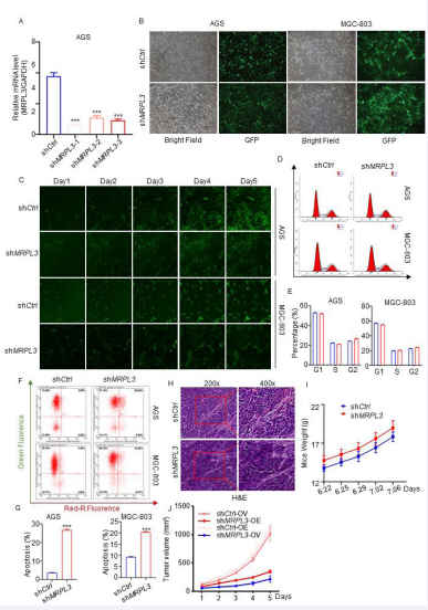 Figure S2 A. RT-PCR analyses of MRPL3 expression in AGS cells infected with shCtrl, shMRPL3-1, shMRPL3-2, and shMRPL3-3. B. The cell fluorescence of AGS and MGC-803 cells infected with shCtrl and shMRPL3-1. C. The cell fluorescence of AGS and MGC-803 cells infected with shCtrl and shMRPL3-1 and cultured for 5 days under Celigo cell count assays. D-E. Flow cytometry of detection and analyses of Cell Cycle in AGS and MGC-803 cells infected with shCtrl, shMRPL3-1. F-G. Cell apoptosis detection and analyses of of Cell Cycle in AGS and MGC-803 cells infected with shCtrl, shMRPL3-1. H-I. The H&E of tumor and weight of mice. Statistical analyses were performed with one-way ANOVA followed by Tukey’s mulple comparison’s tests. *, p<0.1; **, p<0.01; ***p<0.001.
