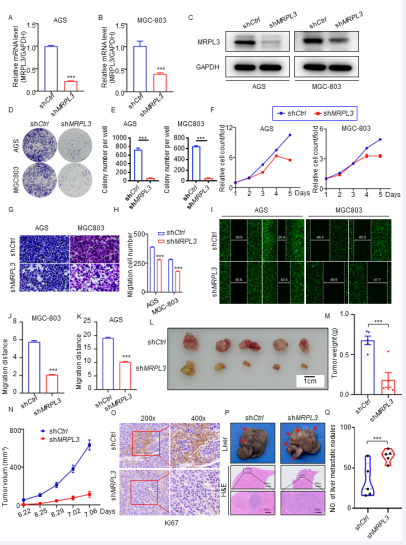 Moreover, transwell assays and woundhealing proved that MRPL3 inhibition significantly decreased the invasive ability of gastric cancer cells [Fig 2G-J]. To further investigate the biological role of MRPL3 in gastric cancer in vivo, AGS-shCtrl and AGS-shMRPL3 cells were subcutaneously injected into BALB/c nude mice using a xenograft assay under the same conditions. As expected, the tumors formed by AGS-shMRPL3 cells were significantly slower and lighter than those formed by AGS-shCtrl cells [Fig 2L-N, S2H-J]. Immunohistochemical analysis of Ki67 revealed that the underlying mechanism of this phenomenon is that inhibition of MRPL3 significantly suppresses tumor proliferation in vivo [Fig 2 O]. To further examine the effect of MRPL3 on the migration ability of gastric cancer in vivo, we subcutaneously injected AGSluciferase-shCtrl and AGS-luciferase-shMRPL3 cells into the spleens of nude mice to establish a liver metastasis model of gastric cancer. As [Fig 2P-O] shows, the nodes formed in the spleen by AGS-shMRPL3 cells were smaller and fewer than those formed by AGS-shCtrl cells. Taken together, our results suggested that MRPL3 knockdown significantly inhibited the proliferation and invasion ability of gastric cancer cells in vitro and in vivo.