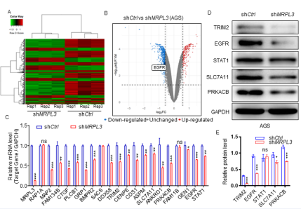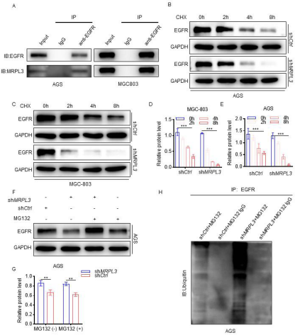 Methods: Here, we assigned 249 tissues from patients who had undergone surgical resection of early gastric cancer at The Affiliated Hospital of Medical School, Ningbo University. We examined the expression and prognostic value of MRPL3 in gastric cancer patients by using tissue microarrays, immunohistochemistry, and survival analysis. We also investigated the molecular effect of MRPL3 on gastric cancer via RNA-seq, RT-qPCR, Western blot, coimmunoprecipitation, and ubiquitination assays. Furthermore, we explored the interaction between MRPL3 and EGFR, a key factor in gastric cancer progression, and elucidated its impact on EGFR signaling and degradation.