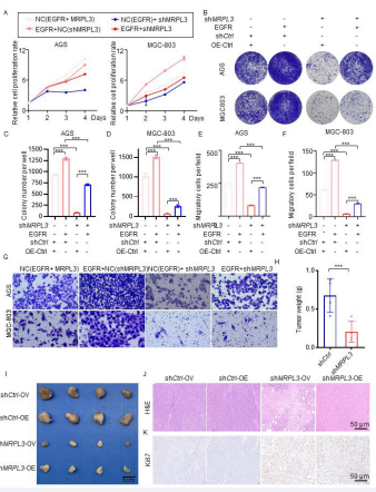 Figure 5 MRPL3 induced the proliferation and aggressive behavior of gastric cancer by inhibiting the ubiquitination and degradation of EGFR. AGS and MGC803 cells were infected with shCtrl+OV, shCtrl+OE, shMRPL3+OV, and shMRPL3+OE. The analyses for the CKK8 assay (A) and harvested for colony formation (B-D) and transwell invasion assays after 48 h of culture (E-G). Statistical analyses were performed with one-way ANOVA followed by Tukey’s multiple comparison tests. *, p<0.1; **, p<0.01; ***p<0.001. H-L. AGS (?shCtrl-OV, shCtrl-OE, shMRPL3-OV, shMRPL3-OE) cells were subcutaneously injected into BALB/c nude mice in a xenograft assay. The tumors were harvested and photographed (I) on day 21. Data for tumor weight (H), H&E (J) and IHC for ki67 of tumors (K) are shown as the mean + SEM (n=4). Statistical analyses were performed with one-way ANOVA followed by Tukey’s multiple comparison tests. *, p<0.1; **, p<0.01; ***p<0.001.