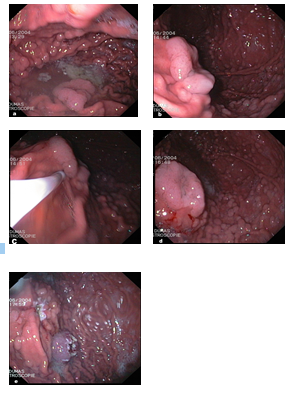 Biopsies confirmed the adeno-villous type of these polyps with low-grade dysplasia. Therapeutic endoscopic procedure was performed for resection of the large polyps (Figure 4b and 4c).
