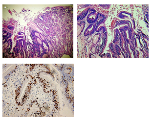 Immunohistochemistry using MIB1 for detection of antigen Ki-67 proved proliferating dysplastic cells (Figure 3c).