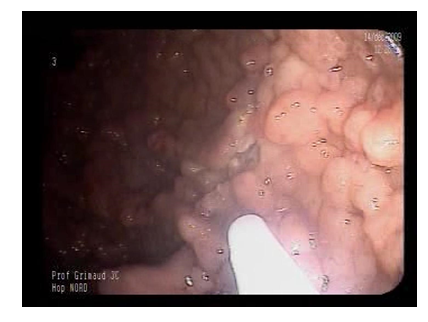 A 24-year-old man, smoker, previously diagnosed with FAP. His father has also been diagnosed as having FAP. He underwent a prophylactic total colectomy with ileoanal anastomosis, when he was 16 years old. He presented to our institution for endoscopic follow-up and surveillance planning. A rectoscopy was performed and showed normal pouch. At the same time, upper gastrointestinal endoscopy was done and showed a tiny 3 mm duodenal polyp, removed by snare polypectomy. The antrum mucosa was normal, but the body and fundus were carpeted with small polyps ranging in size from 2 to 5 mm. In addition, there was a large 2.5cm “ear shape” polyp, located in the midfundus,along the greater curvature (Figure 2a and 2b).