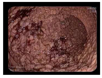 A 62-year-old woman, known to have AFAP, underwent total colectomy with ileo-rectal anastomosis at the age of 45. Surveillance by upper and lower gastrointestinal endoscopy was performed regularly. The last one showed normal rectal and ileal mucosa. Upper gastrointestinal endoscopy was done and revealed normal papilla and duodenal mucosa; however the stomach showed numerous fundic gland polyps, many of them had a large diameter ranging from 1 to 3 cm, along the great curvature (Figure 4a).