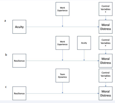 Figure 1: Conceptual frameworks for analysis predicting moral distress in nurses with various inclusion of various moderators.
