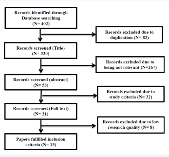 Three steps were conducted to achieve the relevant studies after duplicated studies from selected databases had been removed Figure 1. At the first stage the title of all found studies were scanned by two independent researchers and all studies deemed irrelevant by the exclusion criteria were omitted. The remaining studies moved on to the second step were the abstracts were reviewed and all studies deemed irrelevant were again removed. Finally the full texts of the remaining studies were reviewed and those studies that met the inclusion criteria were chosen for further analysis (13 studies). The bibliography of the remaining studies was searched to include 3 additional studies that were not found within the searched databases Figure 1.