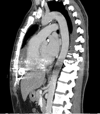 Figure 2: Complete removal of the descending thoracic aortic thrombus after medical treatment