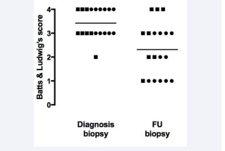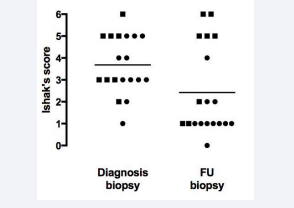 In the 19 children with pairedbiopsies, a significant regression was observed in both fibrosis and inflammation scores between baseline and follow up biopsy. The fibrosis score decreased from 3 (1-6) to 1 (0-6) (p=0.01), and inflammation score from 3 (2- 4) to 2 (1-4) (p<0.01) (Figures 1,2).