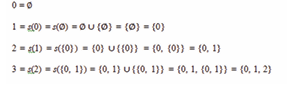 We can then define the set of natural numbers N as the intersection of all sets closed under s that contain the empty set. Each natural number is equal (as a set) to the set of natural numbers less than it. It follows from Equation (2) that;
