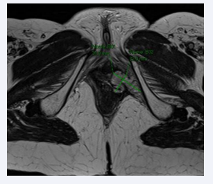 Figure 3: Pelvic MRI with constrast showing 3 cm lesion in the left vulvar region, infiltrating the vaginal orifice and the distal third of the left lateral vaginal wall, as well as the left ischiocavernosus and bulbospongiosus muscles, reaching the medial cortical profile of the left ischiopubic ramus.