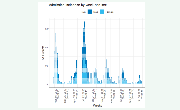 Between8th March 2020 and 31st December 2021, 1,143 adult patients were admitted with laboratory-diagnosed Covid-19 and were included in our study. There were more men (628, 54.9%) than women, and more patients were admitted during 2020 (764, 66.8%), than 2021. Their demographic characteristics (sex, age, distribution by decades, ethnicity), and comorbidities are shown in Table 1 (those with higher numbers and statistically significant variables are included; and complete tables with all the variables studied are offered as supplementary material). Most patients (81%) were white. Median age was 66.6 years (interquartile range –IQR- 27.7). Admission incidence by week and sex appears at Figure 1.