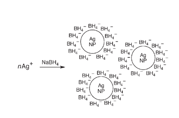Figure 1: Silver nanoparticles stabilized by repulsive forces generated by borohydride anion. (Adopted from Ref. 37)
