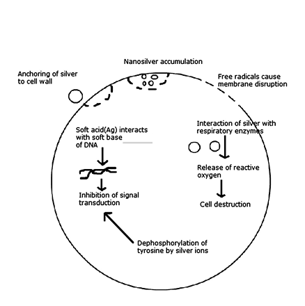 There are various mechanisms by which nanoparticles promote antibacterial activity ranging from (a) formation of pits in cell wall, (b) disruption of cell membrane via free radical formation by nanoparticles and inhibition of respiratory enzymes by free oxygen species produced by silver nanoparticles and silver ion, and (c) binding of silver nanoparticles with soft basic residues within the cell, e.g., DNA. Depending upon their size, shape, and composition, they are capable of penetrating the cell membrane and influencing the intracellular processes.