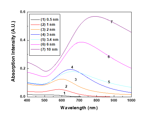 The absorption spectra of gold nanostructured films of thickness ranging from ~0.5 - 15 nm were recorded in the wavelength range from 400 – 1000 nm (Figure 1) and the localized surface plasmon resonance (LSPR) wavelengths were assigned to the absorption maximum in each spectrum. Here the absorption spectrum of ~15 nm thick film is not shown in Figure (1).