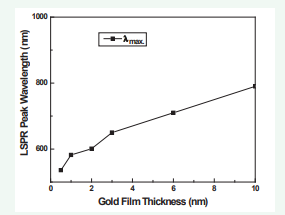 Figure 2 Variation in the localized surface plasmon resonance (LSPR) peak wavelengths with film thicknesses.