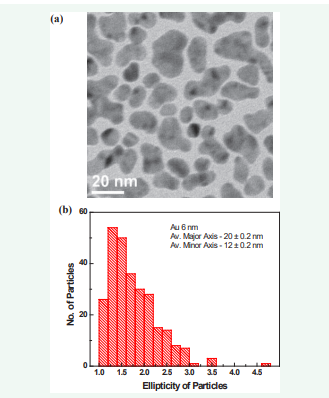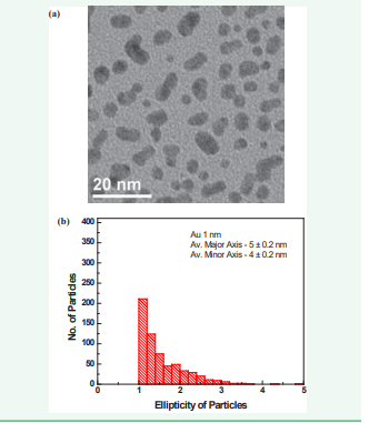 show the TEM images of the gold films as well as distribution of ellipticity (the ratio of major to minor axis) of the NPs for 1, 3 and 6 nm thick films respectively. It shows that the 1 nm thick film has mostly spherical NPs with ellipticity one. As the film thickness increases to 3 nm, the shapes of nanoparticles start changing (ellipticity > 1) but still more number of particles are in spherical shape with ellipticity one (Figure 4).
